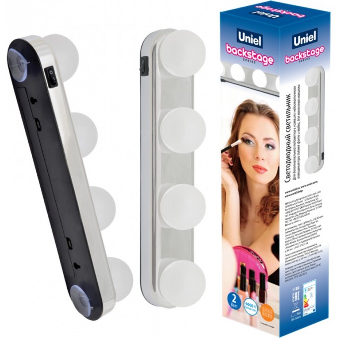 Светодиодный светильник предназначен для подсветки в условиях темноты или недостаточного освещения в режиме съемки фото и видео, для нанесения макияжа.. Для простоты установки на светильнике имеются присоски, в комплекте, с помощью которых светильник можно установить на монтажную поверхность, а также допускается установка на винты, в комплект не входят. Цветовая температура 4000 К. Мощность светильника 2 Вт. Световой поток 360 ЛМ, Степень защиты IP20. Светильник работает от 4 батареек АА, батарейки в комплект не входят.